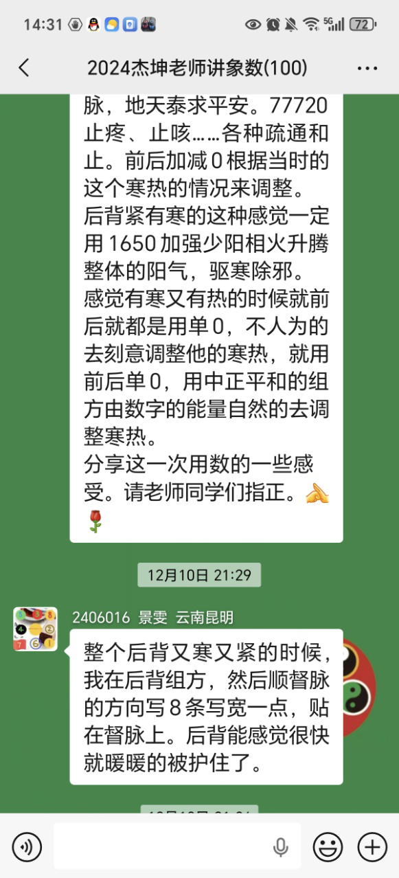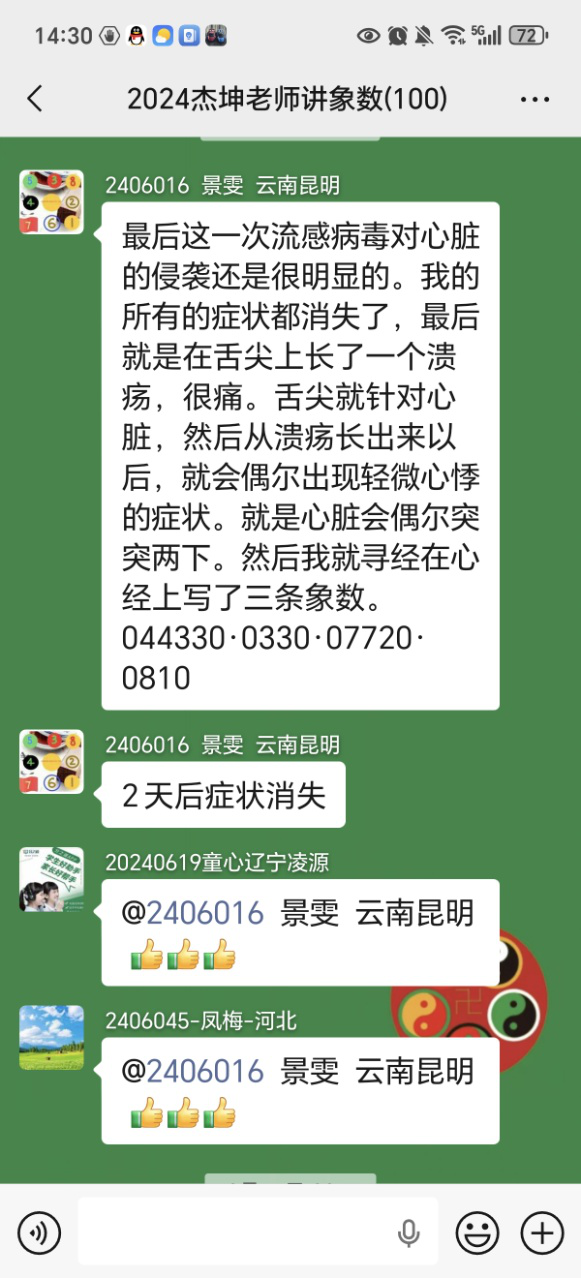 第2天喉咙痛的症状就减轻了,然后有一些化热,第二天就都是稠鼻涕,然后咳嗽。肺中有痰。头痛减轻,咳嗽的时候扯着头疼。然后继续是扎针加象数。因为我用